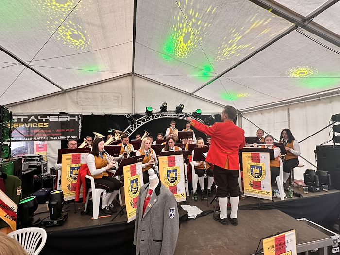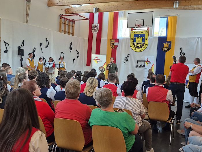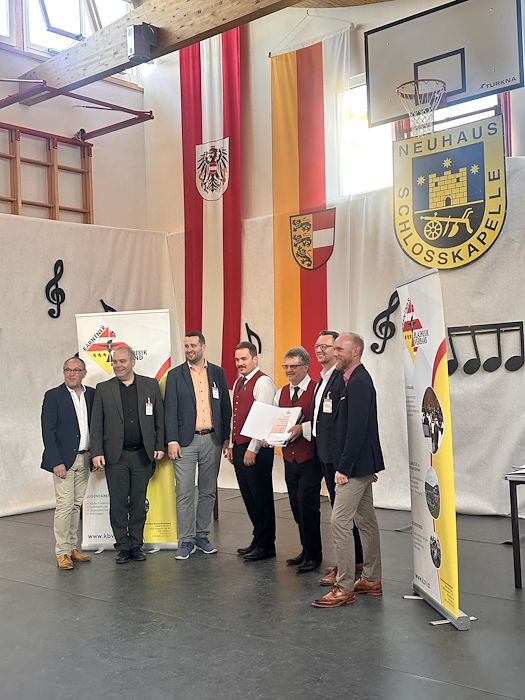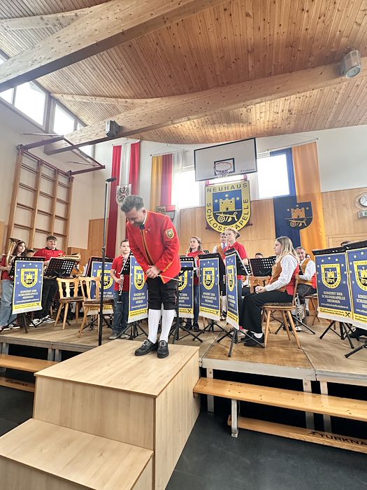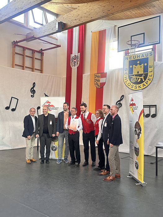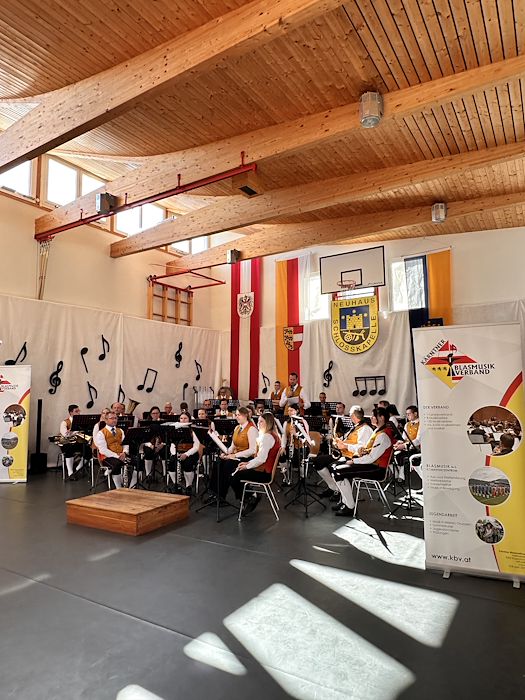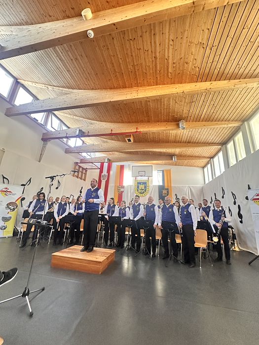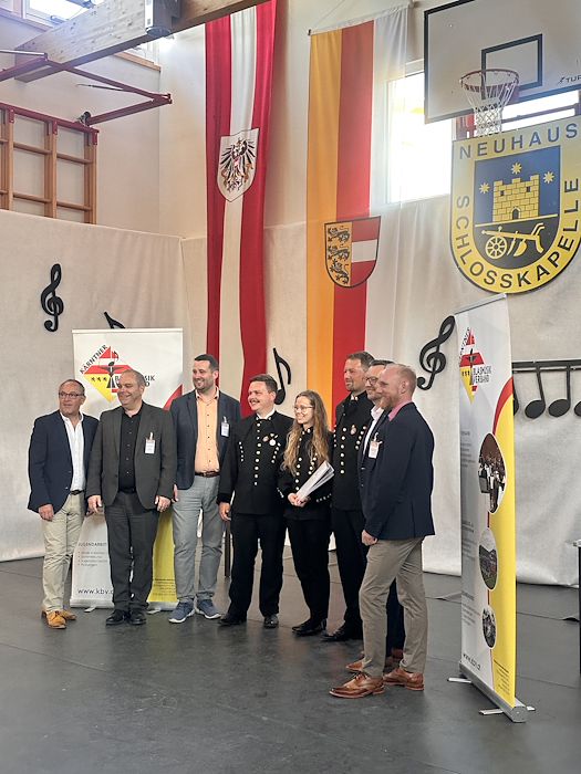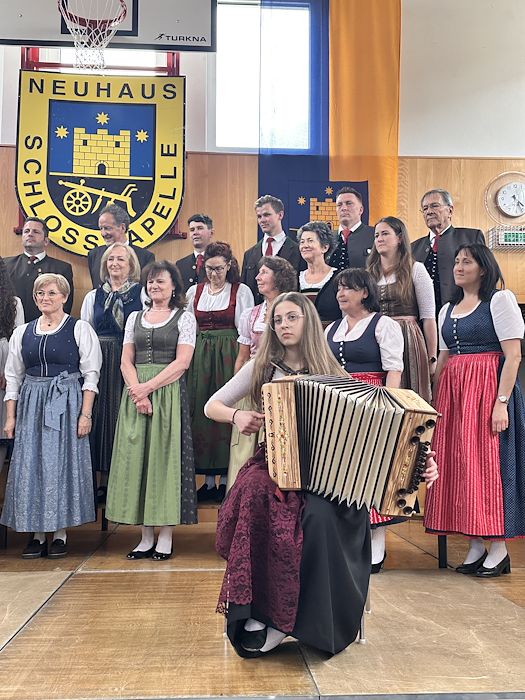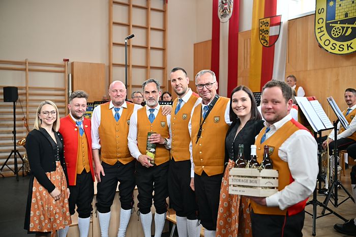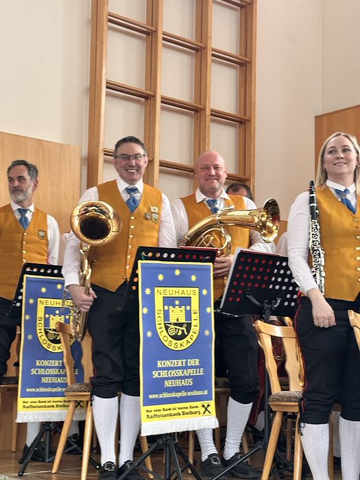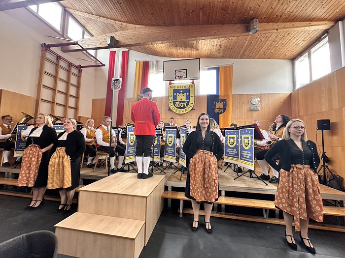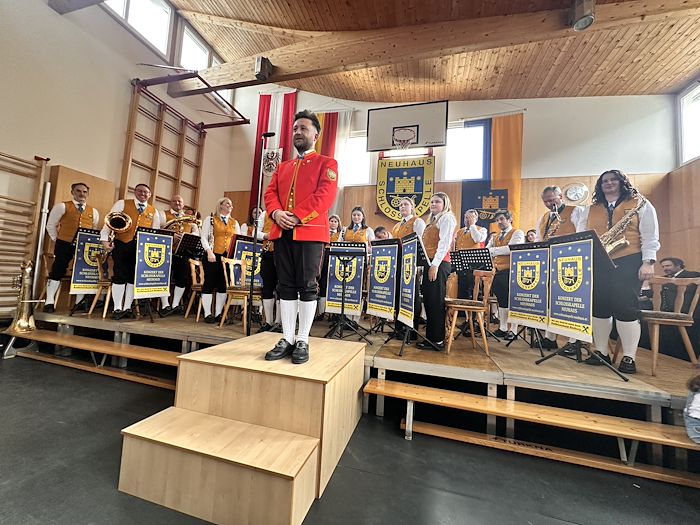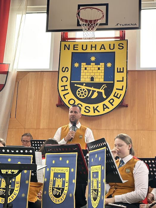 Die Schlosskapelle Neuhaus eröffnete gemeinsam mit ihrem Jugendensemble das Konzert und überzeugte mit einem abwechslungsreichen und schwungvollen Programm. Unter der Leitung von Johannes Glawischnig zeigten die Musikerinnen und Musiker ihr großes Können und sorgten für einen gelungenen Auftakt. Obmann Hannes Hirm begrüßte einige Ehrengäste im ersten Teil.